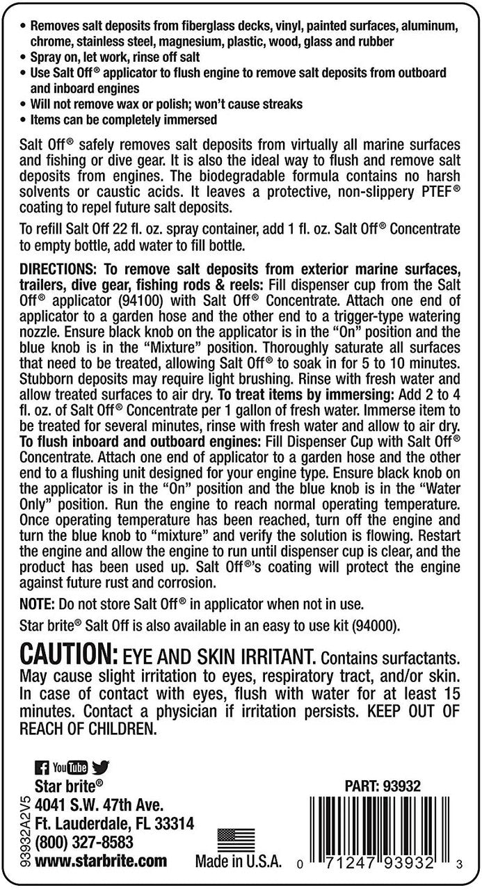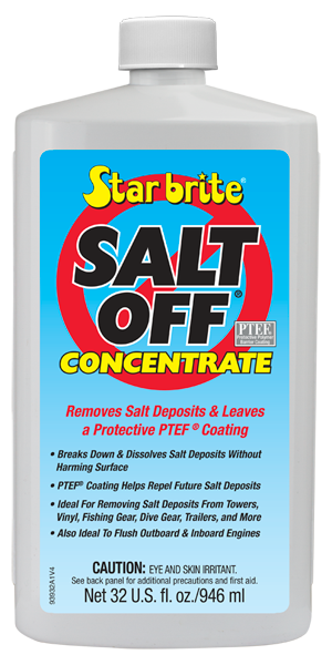 Salt Off Protector is specifically formulated to quickly and effectively remove salt deposits from metal, fiberglass, plastic or painted surfaces. It contains special polymers that bond to the treated surface to help prevent the formation of future deposits. Salt Off can be sprayed directly onto the surface to be treated and then rinsed with fresh water, or simply left in place.
