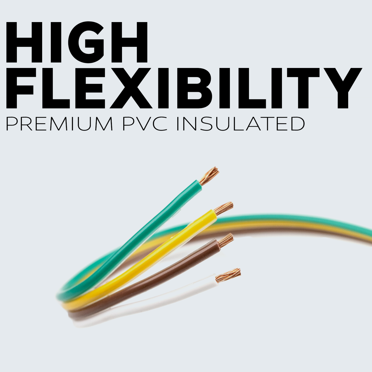 EFFORTLESS INSTALLATION WITH COLOR-CODED WIRES – Simplify your trailer's electrical setup with our 4-Way Bonded Flat Trailer Wire, featuring four color-coded wires (White, Brown, Yellow, Green). Connecting your trailer lights, brakes, turn signals, auxiliary power, and other essential components becomes a breeze. The intuitive color-coding system allows for quick identification and hassle-free installation, making it ideal for both experienced users and those with limited experience.